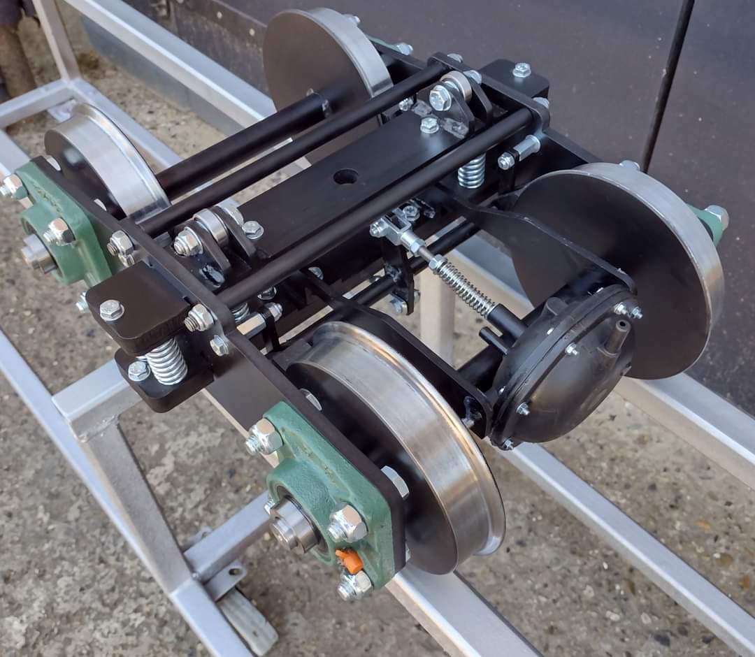 6″ diameter narrow gauge profile EN8 wheels | Sealed self aligning wheel bearings | integrated vacuum braking on all 4 wheels | Mechanical ABS system | Low maintenance | Easily adjustable brakes.