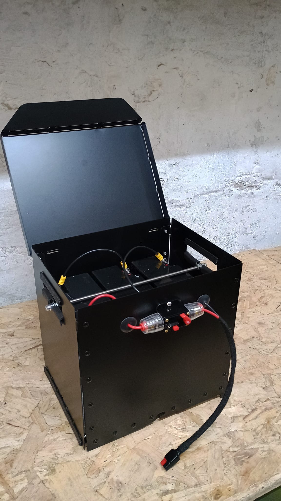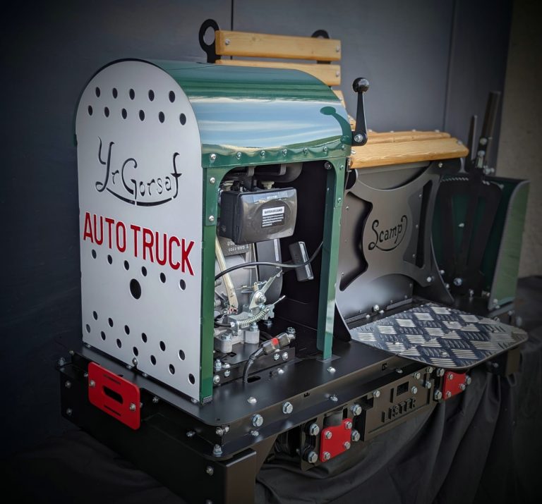 Petrol engine | 2x 800 watt electric motors, one to drive the wheels, one used as a dynamo | Hand operated braking | 5″ diameter wheels | 5-8mph